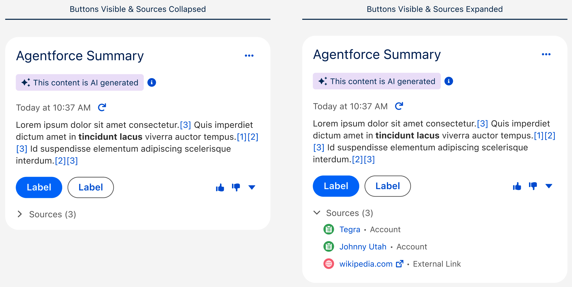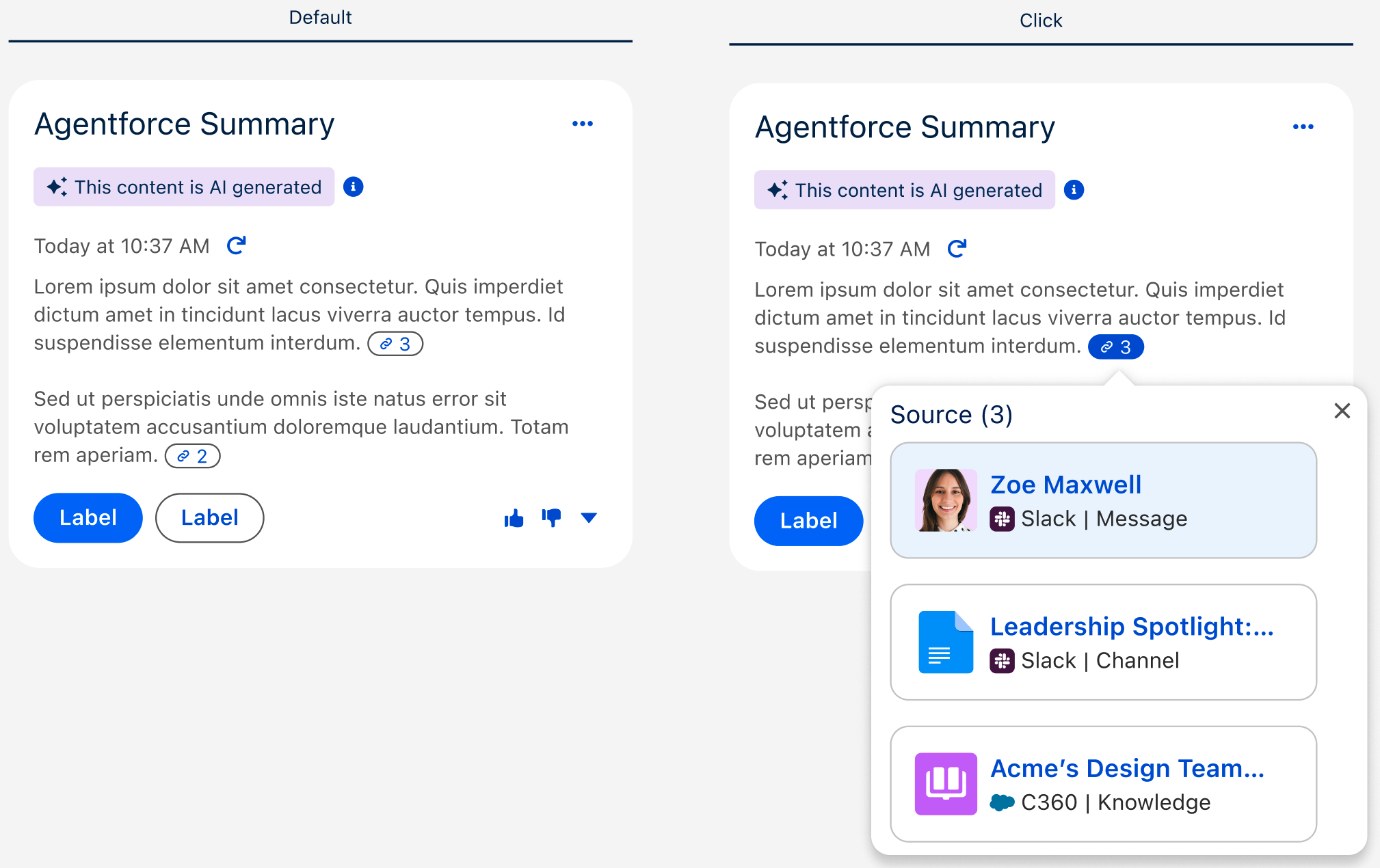 The new design improves readability by removing inline citation disruption and shifting source access to a popover. This also eliminates layout shifts—keeping the AI card height stable and preventing content from being pushed down on interaction.